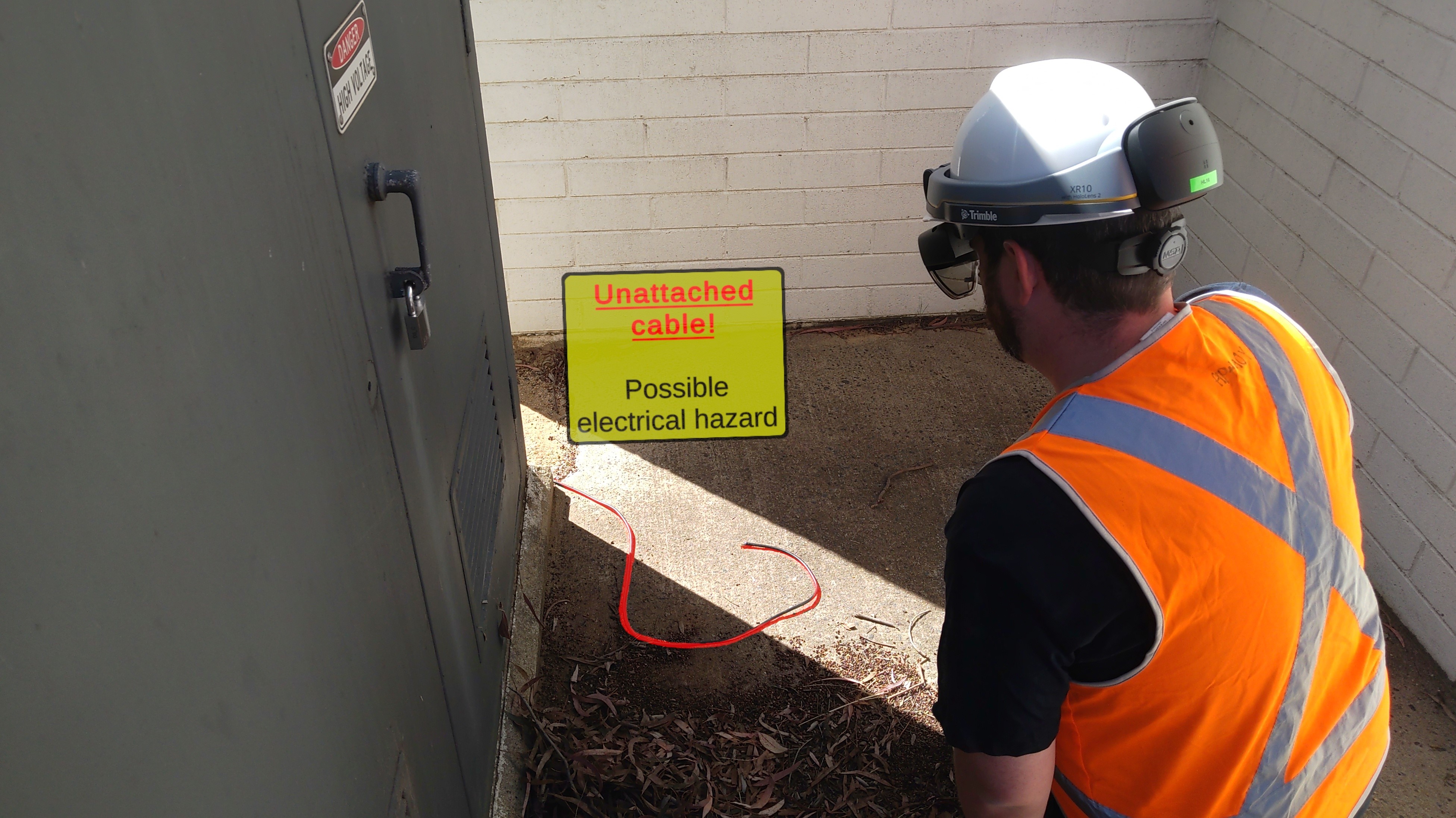 Image caption: Tech4HSE researcher Stuart Anderson testing prototype augmented reality technology that highlights and alerts the headset wearer to a possible electrical hazard. Image credit: CSIRO